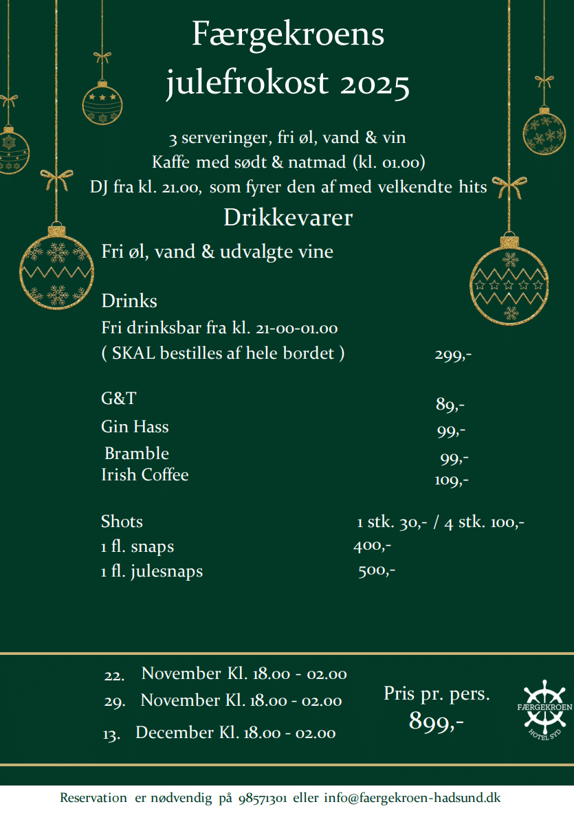Ønsker I at høre mere, så kan vi kontaktes på 9857 1301 eller på info@faergekroen-hadsund.dk
