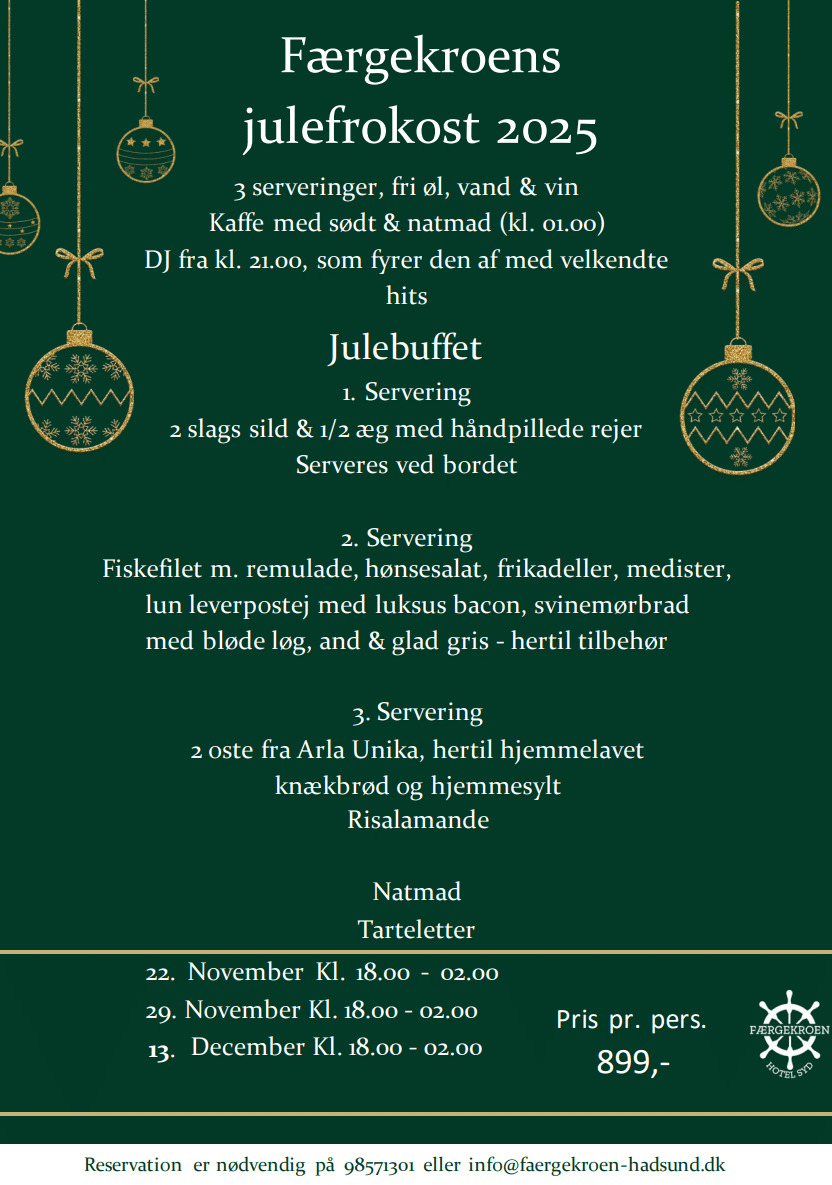 Ønsker I at høre mere, så kan vi kontaktes på 9857 1301 eller på info@faergekroen-hadsund.dk